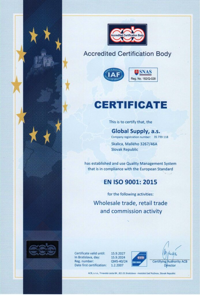 Sme držiteľmi certifikátu systému manažérstva kvality podľa normy EN ISO 9001:2015, ktorý potvrdzuje náš záväzok poskytovať produkty a služby v súlade s medzinárodne uznávanými štandardmi. Tento systém zabezpečuje efektívne procesy, dôslednú kontrolu a trvalé zlepšovanie vo všetkých oblastiach činnosti.